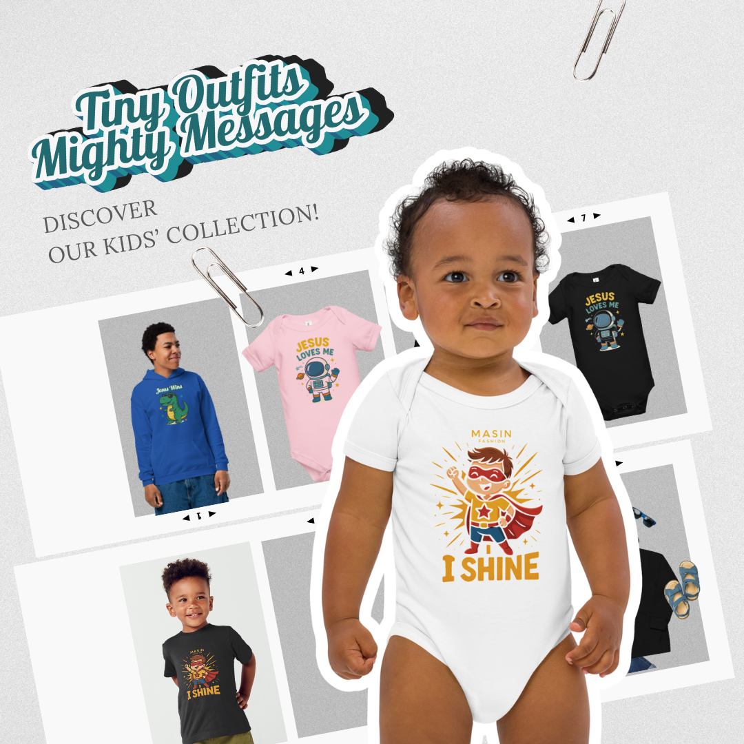 Explore our Kids Collection, Fun & Faith-filled designs, Comfy for every adventure, Perfect for birthdays, Sundays & everyday smiles